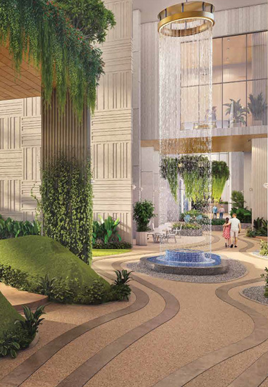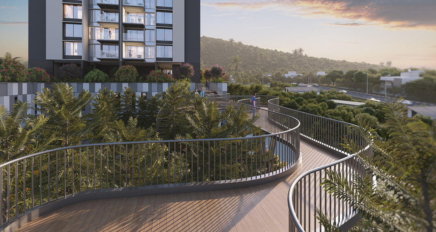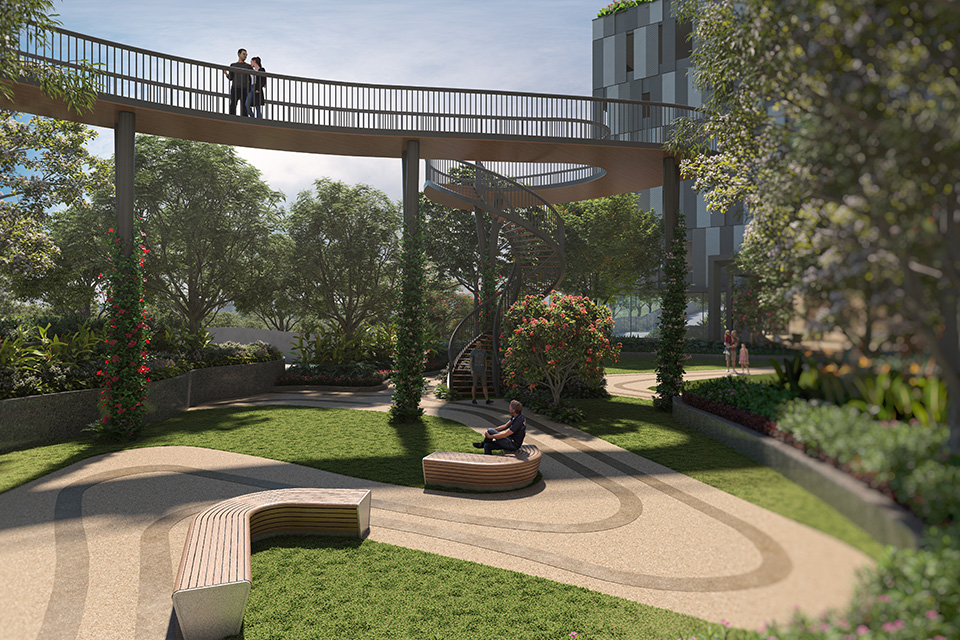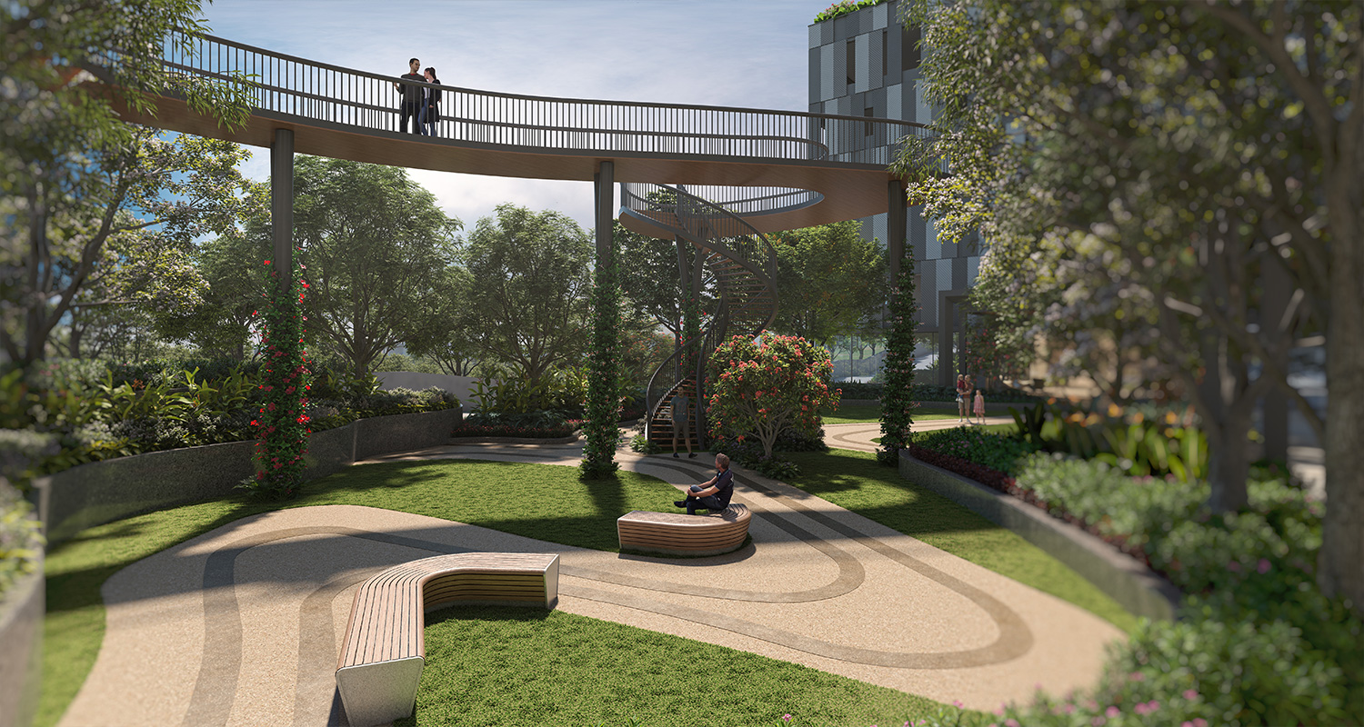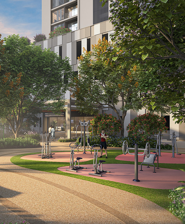 Cascading evergreen, seating gallery & outdoor fitness zone